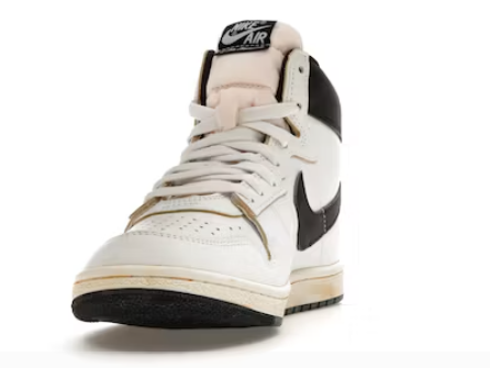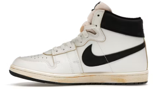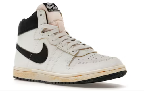 A high-top sneaker, the Nike Jordan Air Ship PE SP has a black collar with a shiny “NIKE AIR” imprint on the right shoe and an A Ma Maniére logo on the left. The black color also adorns the Swoosh insignia on the quarter panels. The rest of the shoe is white with a leather finish, except for the tongue, which has a nylon textile and a sewn-on sticker with the brand logo embroidery. On the upper is a stylish perforation.